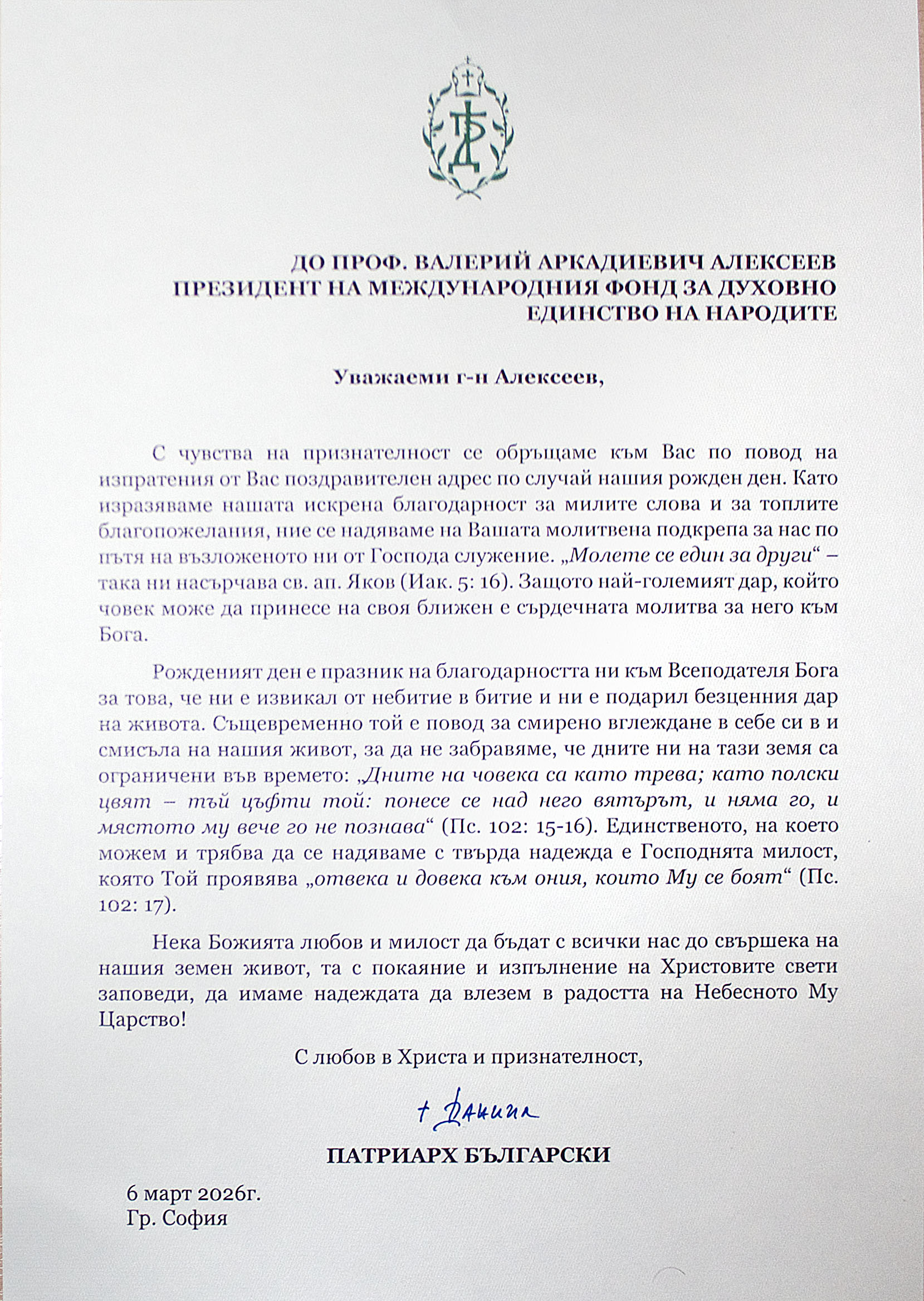 29 апреля 2026 года в Международный Фонд духовного единства народов на имя Президента Фонда профессора В.А.Алексеева поступило благодарственное письмо от Святейшего Патриарха Болгарского Даниила за поздравление в его адрес по случаю дня Рождения.