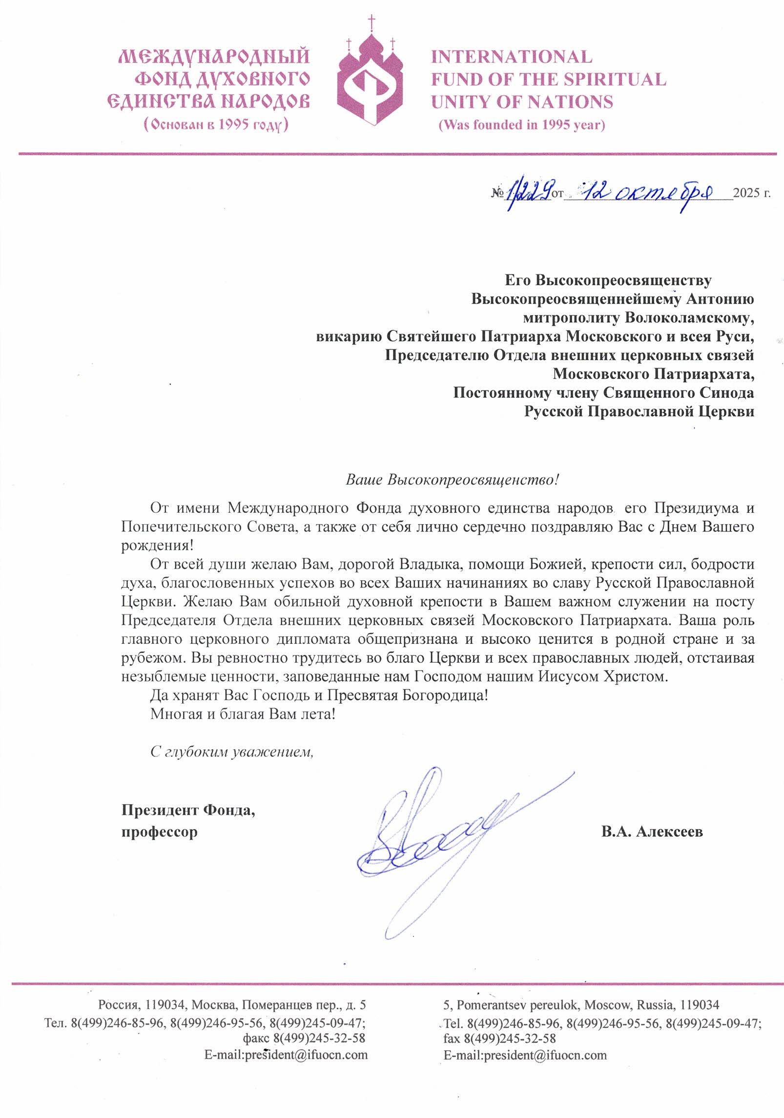 Москва. Россия. 12 октября 2025 года Президент Международного Фонда духовного единства народов (МФДЕН) профессор В.А.Алексеев поздравил викария Святейшего Патриарха Московского и всея Руси, Постоянного члена Священного Синода Русской Православной Церкви, Председателя Отдела внешних церковных связей Московского Патриархата Его Высокопреосвященство Митрополита Волоколамского Антония с днем Рождения: