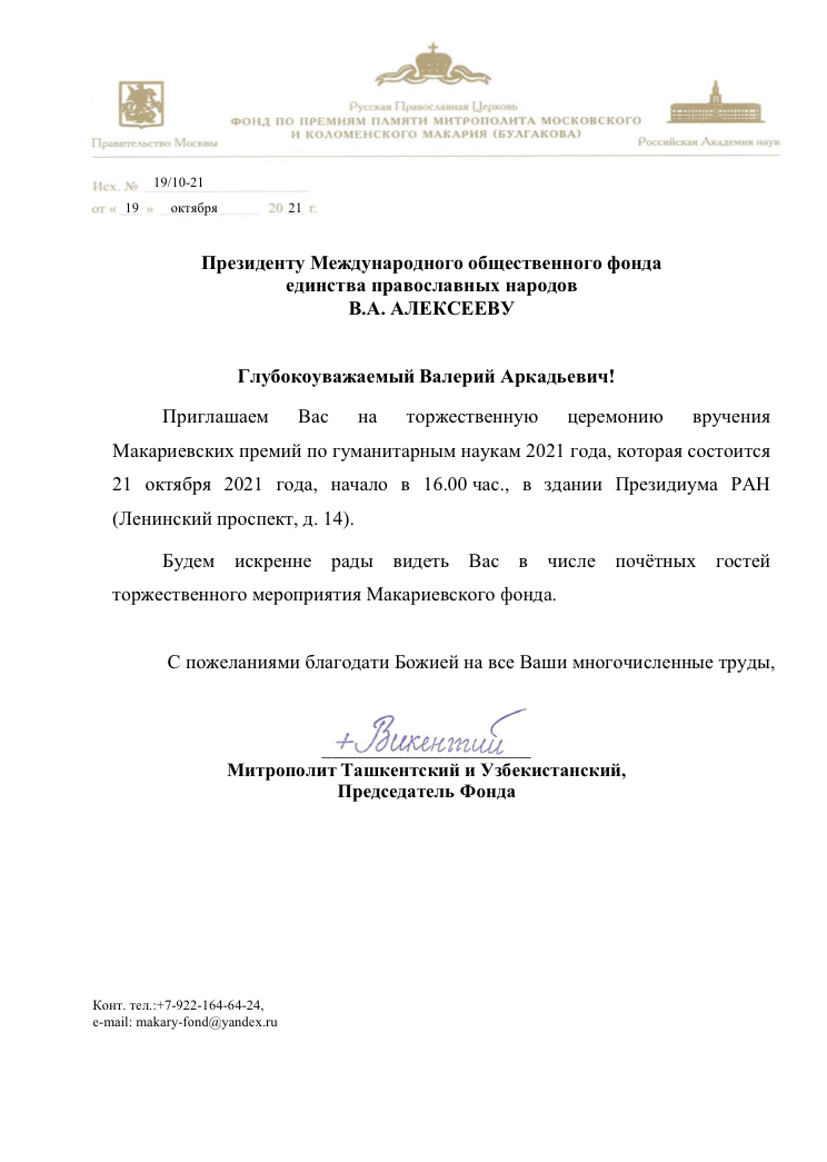 Москва. Россия. 21 октября 2021 года Президент Международного общественного Фонда единства православных народов (МОФЕПН) профессор В.А. Алексеев был приглашен в качестве почетного гостя и принял участие в торжественной церемонии вручения Макарьевских премий по гуманитарным наукам за 2021 год, которая состоялась в Москве в здании Президиума Российской академии наук (РАН).
