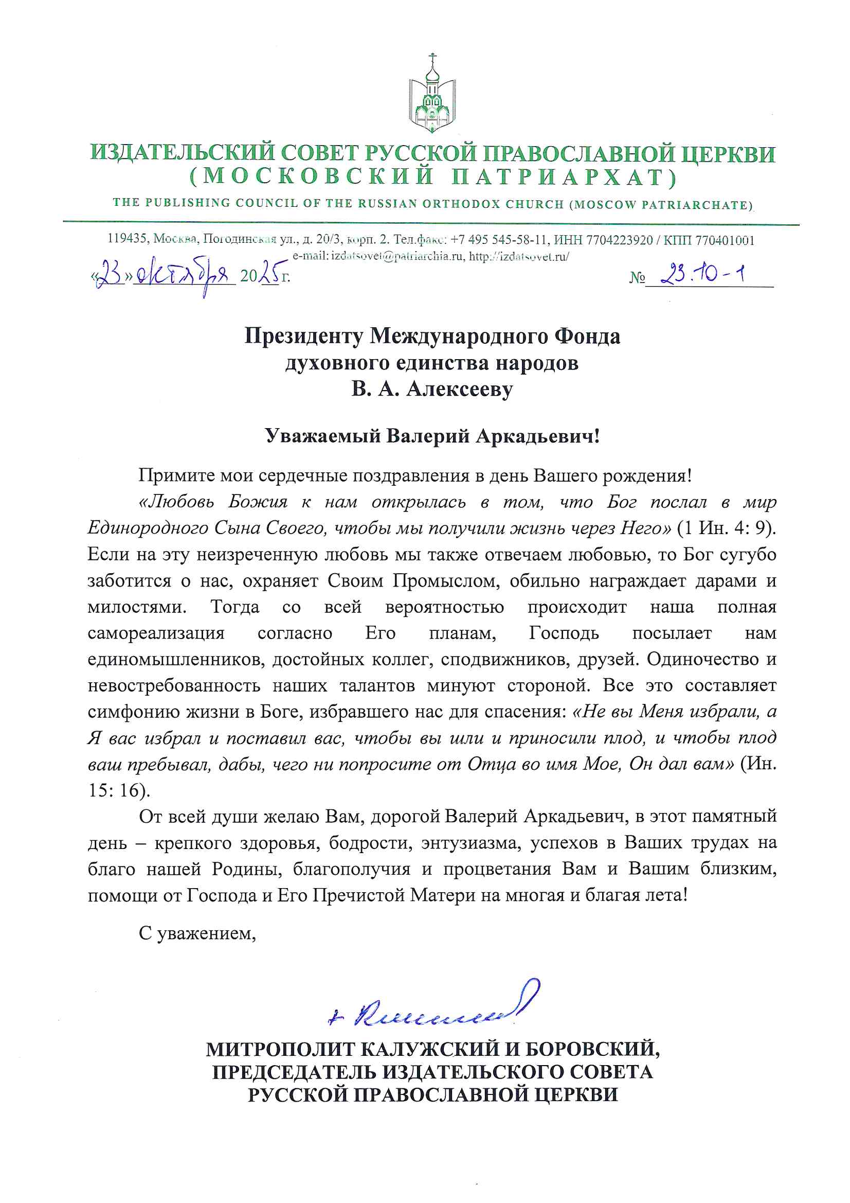 От Его Высокопреосвященства Председателя Издательского Совета Русской Православной Церкви Митрополита Калужского и Боровского Климента