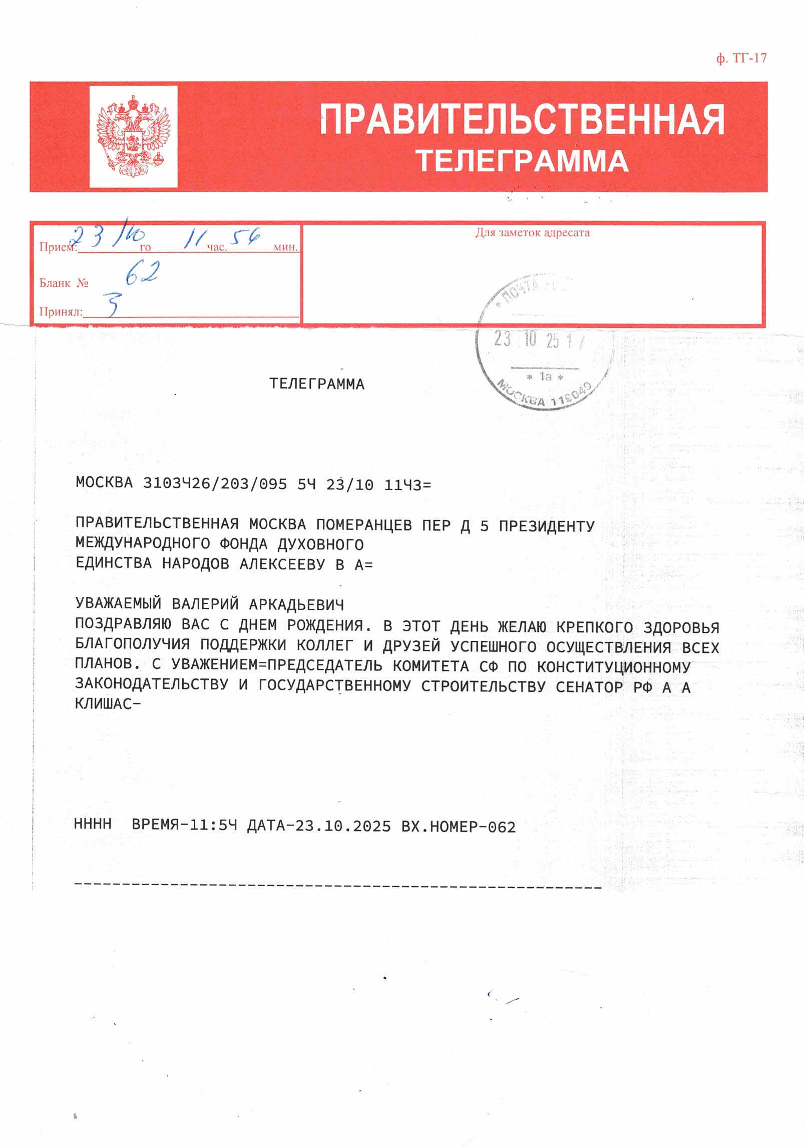 От Председателя Комитета Совета Федерации Федерального Собрания Российской Федерации по конституционному законодательству и государственному строительству Сенатора РФ Андрея Александровича Клишаса