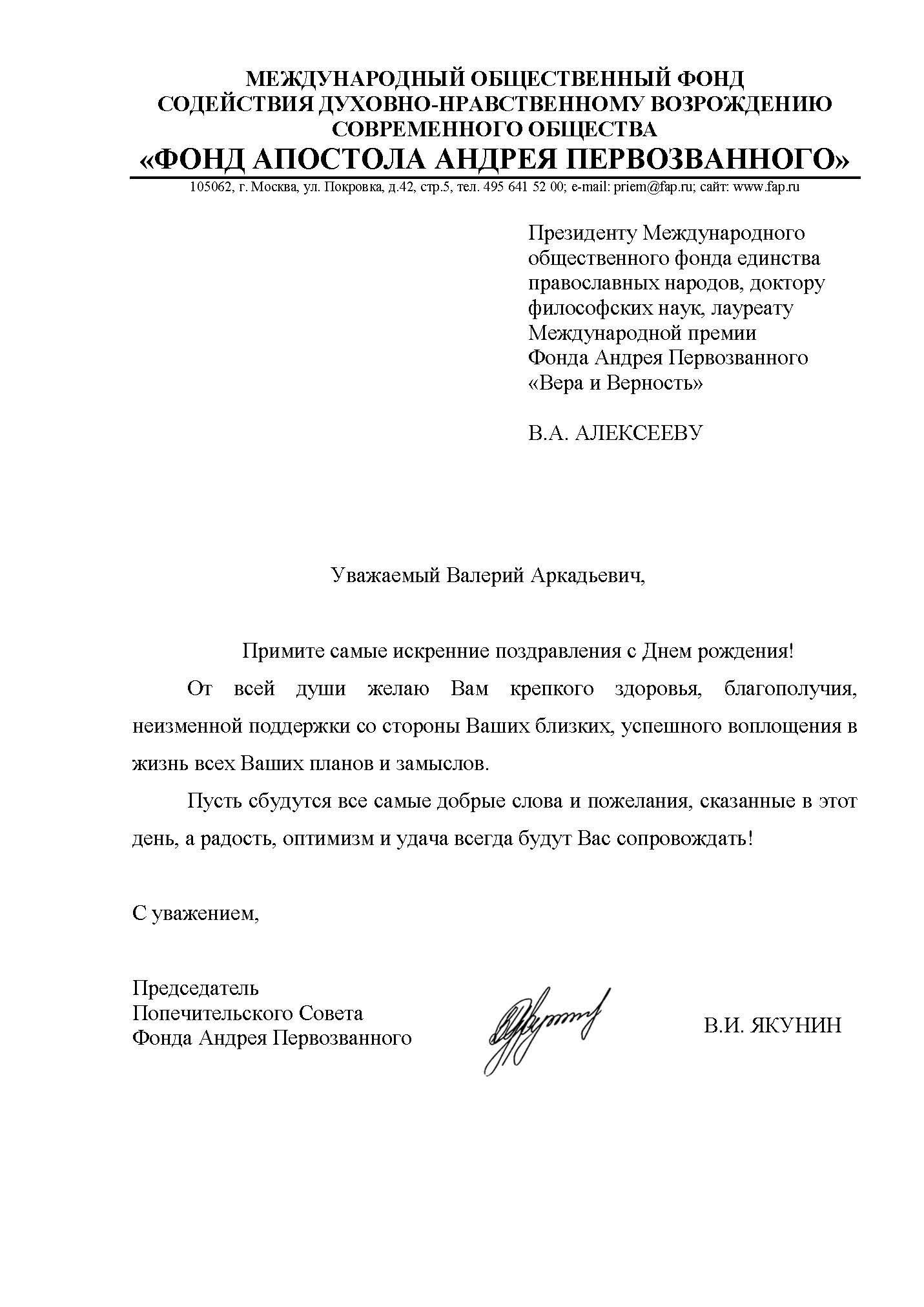 Председателя Попечительского Совета Фонда Андрея Первозванного Владимира Ивановича Якунина