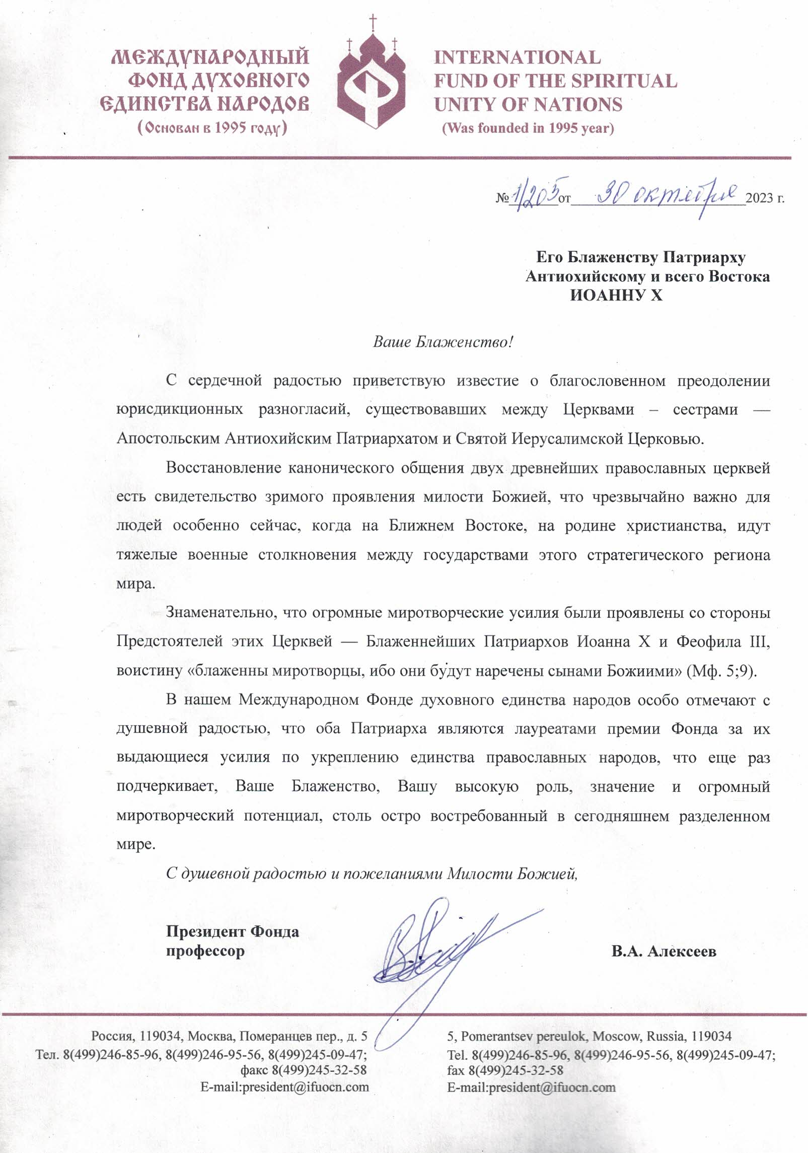 Москва. Россия. 30 октября 2023 года. Международный Фонд духовного единства народов (МФДЕН) обратился с приветственными Посланиями к Блаженнейшим Патриархам Иерусалимскому и всей Палестины Феофилу III и Антиохийскому и всего Востока Иоанну X, в которых выразил сердечную радость по поводу принятых этими Церквами благословенных решений о восстановлении канонического общения между ними.